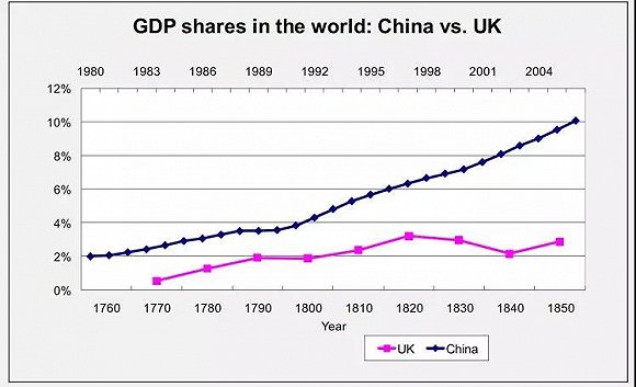 上面這張圖講的是,中國經濟改革開放以來占全球經濟的GDP比重,從1980年的2%(按照市場匯率算),到了本世紀初的10%,現在是15%。反觀英國,工業革命前其經濟占全球經濟的比重在0.5%左右,工業革命后則始終在4%以下,所以如果純粹按占經濟比重而言的話,我們的經濟崛起比當年英國工業革命意義更大。