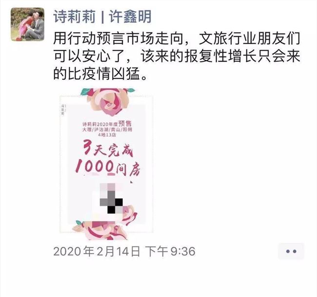 對負面消息最好的回應便是業(yè)績。 2 月 14 日下午,許鑫明曬出了詩莉莉的階段性成果: 3 天 1000 間房。